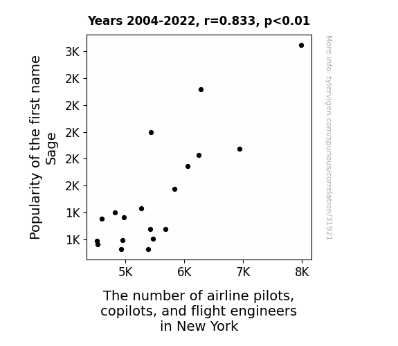 This means 69.3% of the change in the one variable (i.e., The number of airline pilots, copilots, and flight engineers in New York) is predictable based on the change in the other (i.e., Popularity of the first name Sage) over the 19 years from 2004 through 2022.