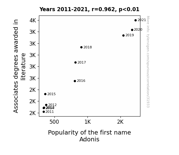 This means 92.6% of the change in the one variable (i.e., Popularity of the first name Adonis) is predictable based on the change in the other (i.e., Associates degrees awarded in literature) over the 11 years from 2011 through 2021.