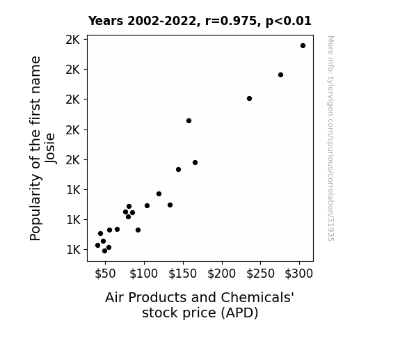 This means 95.2% of the change in the one variable (i.e., Air Products and Chemicals' stock price (APD)) is predictable based on the change in the other (i.e., Popularity of the first name Josie) over the 21 years from 2002 through 2022.