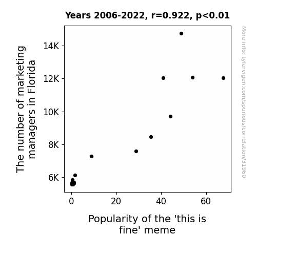 This means 84.9% of the change in the one variable (i.e., Popularity of the 'this is fine' meme) is predictable based on the change in the other (i.e., The number of marketing managers in Florida) over the 17 years from 2006 through 2022.