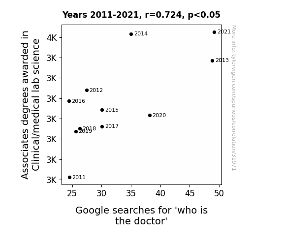 This means 52.5% of the change in the one variable (i.e., Google searches for 'who is the doctor') is predictable based on the change in the other (i.e., Associates degrees awarded in Clinical/medical lab science) over the 11 years from 2011 through 2021.