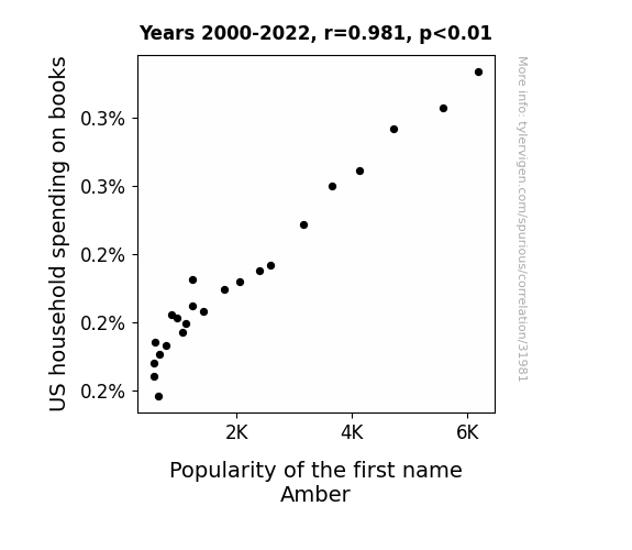 This means 96.3% of the change in the one variable (i.e., Popularity of the first name Amber) is predictable based on the change in the other (i.e., US household spending on books) over the 23 years from 2000 through 2022.