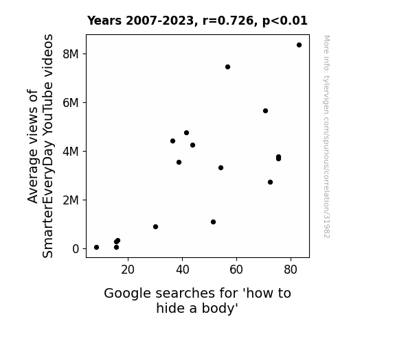 This means 52.8% of the change in the one variable (i.e., Google searches for 'how to hide a body') is predictable based on the change in the other (i.e., Average views of SmarterEveryDay YouTube videos) over the 17 years from 2007 through 2023.