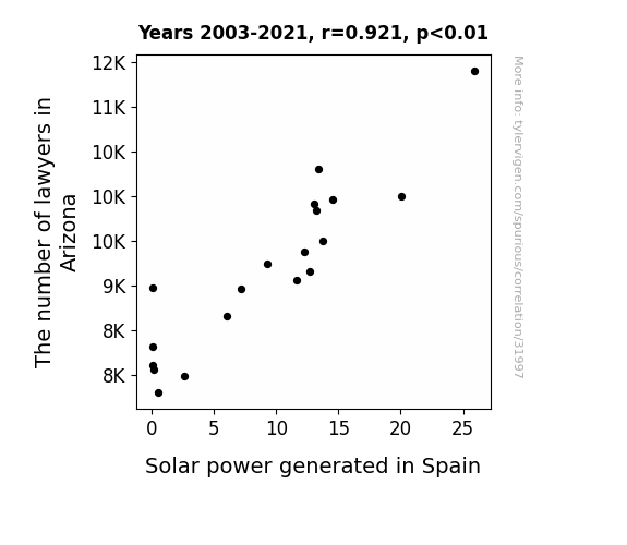 This means 84.8% of the change in the one variable (i.e., Solar power generated in Spain) is predictable based on the change in the other (i.e., The number of lawyers in Arizona) over the 19 years from 2003 through 2021.