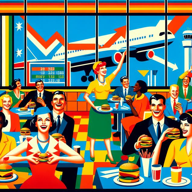 ChatGPT: [ Inspired by bauhaus ] Create a colorful and lively scene of an American diner filled with happy patrons enjoying classic cheeseburgers topped with slices of American cheese. The diner should exude a vibrant and inviting ambiance. Patrons should be depicted with beaming smiles as they savor their delicious meals, radiating joy and gouda feelings. Outside the diner, showcase a bustling airport runway with a Ryanair plane ready for boarding. Travelers eagerly getting on the plane should exude a cheddar mood, visibly excited for their upcoming adventure. In the background, display the stock price ticker for Ryanair Holdings (RYAAY) rising, symbolizing the positive impact of the cheese-induced happiness on the airline's stock. The image should capture the essence of happiness, excitement, and positivity, while incorporating the iconic style of bauhaus.