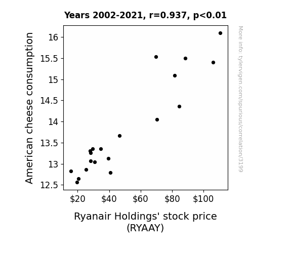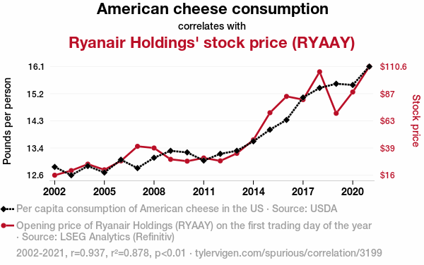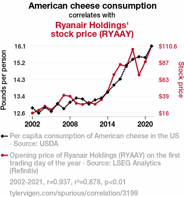 - The spurious research paper: Gouda Investment: Unraveling the Ties Between American Cheese Consumption and Ryanair Holdings' Stock Price