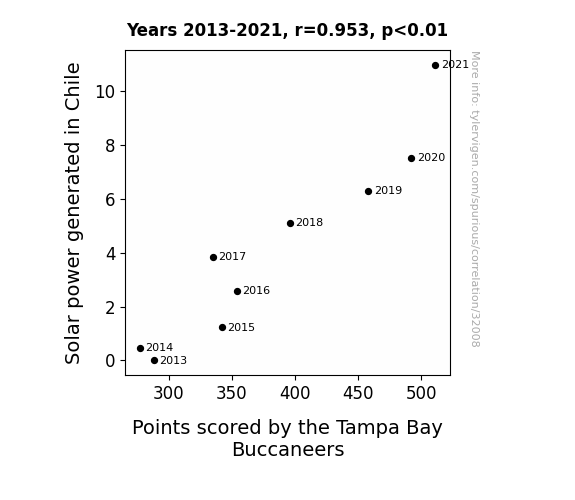 This means 90.9% of the change in the one variable (i.e., Points scored by the Tampa Bay Buccaneers) is predictable based on the change in the other (i.e., Solar power generated in Chile) over the 9 years from 2013 through 2021.