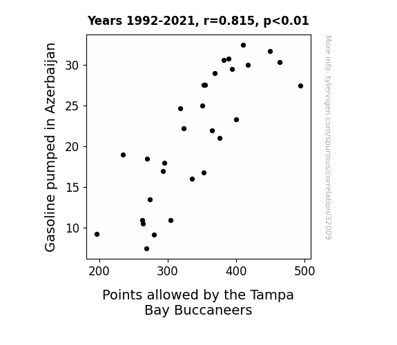This means 66.5% of the change in the one variable (i.e., Points allowed by the Tampa Bay Buccaneers) is predictable based on the change in the other (i.e., Gasoline pumped in Azerbaijan) over the 30 years from 1992 through 2021.