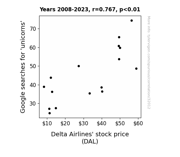 This means 58.8% of the change in the one variable (i.e., Delta Airlines' stock price (DAL)) is predictable based on the change in the other (i.e., Google searches for 'unicorns') over the 16 years from 2008 through 2023.
