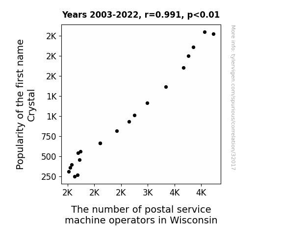 This means 98.2% of the change in the one variable (i.e., The number of postal service machine operators in Wisconsin) is predictable based on the change in the other (i.e., Popularity of the first name Crystal) over the 20 years from 2003 through 2022.