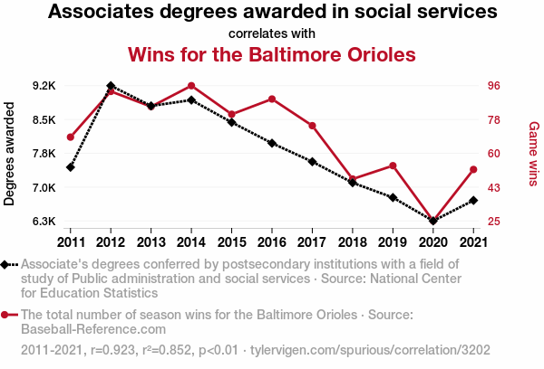 associates degrees, public administration, social services, Baltimore Orioles, wins, correlation, educational trends, athletic success, interdisciplinary perspectives, academic achievements, unexpected correlations, societal phenomena