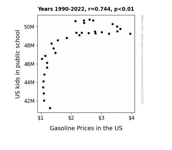 This means 55.3% of the change in the one variable (i.e., Gasoline Prices in the US) is predictable based on the change in the other (i.e., US kids in public school) over the 33 years from 1990 through 2022.