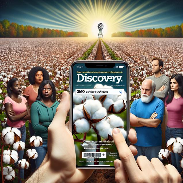 ChatGPT: Generate an image of a discovery magazine cover featuring a vast cotton field in Arkansas under the sun. Rows of genetically modified cotton plants reach towards the sky. Further back, a group of people stand, their faces filled with disbelief, as they collectively mutter "I can't even." In the foreground, a person is typing "I can't even" into the search bar on their phone, with the screen filled with search results related to GMO cotton.