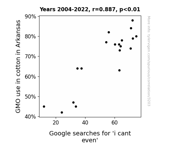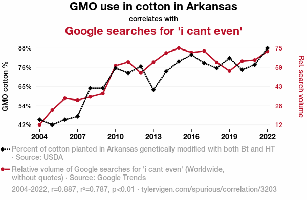 This means 78.7% of the change in the one variable (i.e., Google searches for 'i cant even') is predictable based on the change in the other (i.e., GMO use in cotton in Arkansas) over the 19 years from 2004 through 2022.