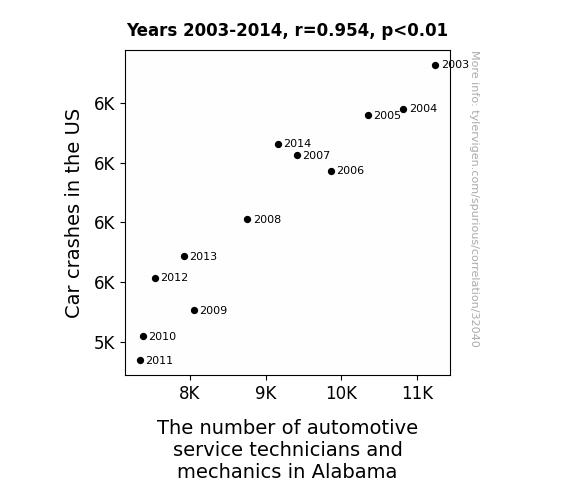 This means 91% of the change in the one variable (i.e., The number of automotive service technicians and mechanics in Alabama) is predictable based on the change in the other (i.e., Car crashes in the US) over the 12 years from 2003 through 2014.