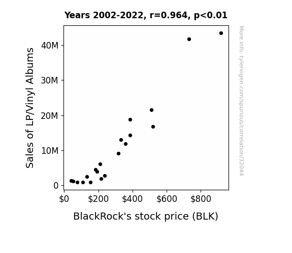 This means 93% of the change in the one variable (i.e., BlackRock's stock price (BLK)) is predictable based on the change in the other (i.e., Sales of LP/Vinyl Albums) over the 21 years from 2002 through 2022.