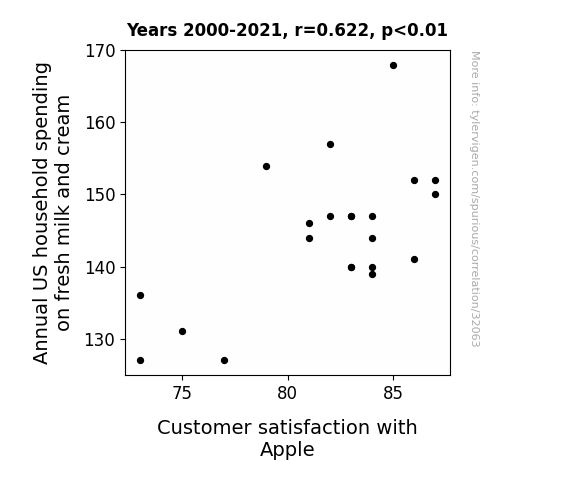 This means 38.6% of the change in the one variable (i.e., Customer satisfaction with Apple) is predictable based on the change in the other (i.e., Annual US household spending on fresh milk and cream) over the 22 years from 2000 through 2021.