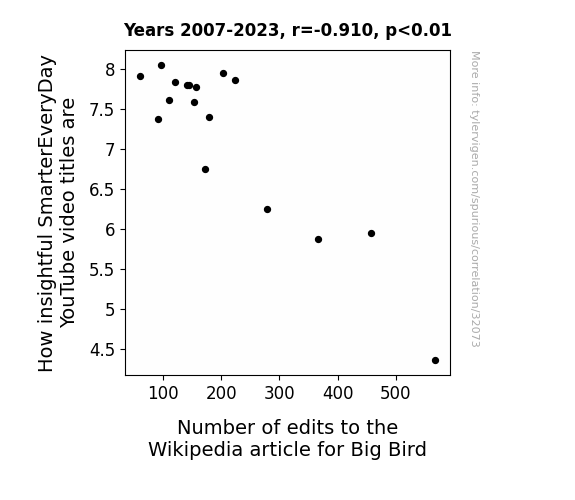 This means 82.9% of the change in the one variable (i.e., Number of edits to the Wikipedia article for Big Bird) is predictable based on the change in the other (i.e., How insightful SmarterEveryDay YouTube video titles are) over the 17 years from 2007 through 2023.
