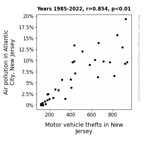 This means 72.9% of the change in the one variable (i.e., Motor vehicle thefts in New Jersey) is predictable based on the change in the other (i.e., Air pollution in Atlantic City, New Jersey) over the 38 years from 1985 through 2022.