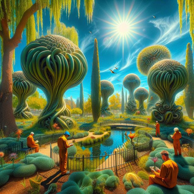 Prompt: Prompt: Generate an surrealist image of a tranquil park in Bakersfield, California. Show a vibrant, otherworldly garden blooming with peculiar, fantastical plants tended to by reformed troublemakers. The sky above the park should be clear and bright, representing the positive impact of reduced pollution. The scene should evoke a sense of wonder and transformation. The depiction should include only scenes, people, and objects, it should not include text or speech bubbles.