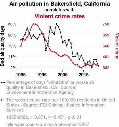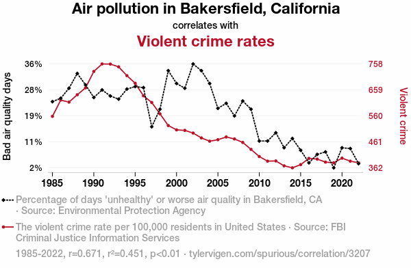 - The spurious research paper: Bakerfield's Bad Air and Brawls: Examining the Link Between Air Pollution and Violent Crime Rates