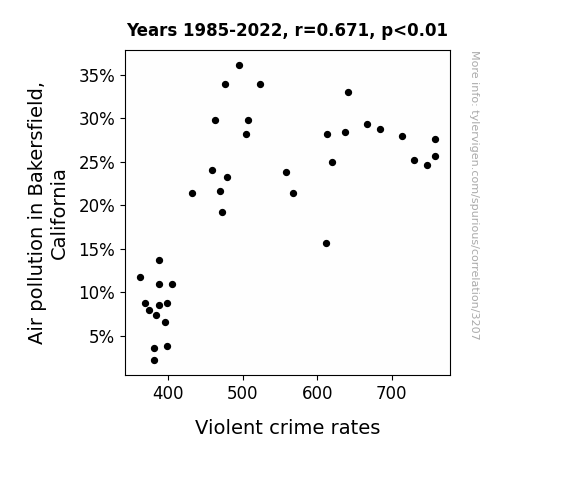 This means 45.1% of the change in the one variable (i.e., Violent crime rates) is predictable based on the change in the other (i.e., Air pollution in Bakersfield, California) over the 38 years from 1985 through 2022.