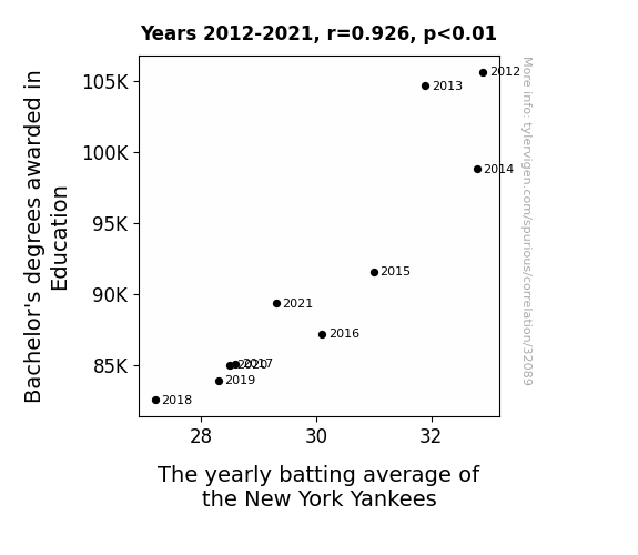 This means 85.7% of the change in the one variable (i.e., The yearly batting average of the New York Yankees) is predictable based on the change in the other (i.e., Bachelor's degrees awarded in Education) over the 10 years from 2012 through 2021.
