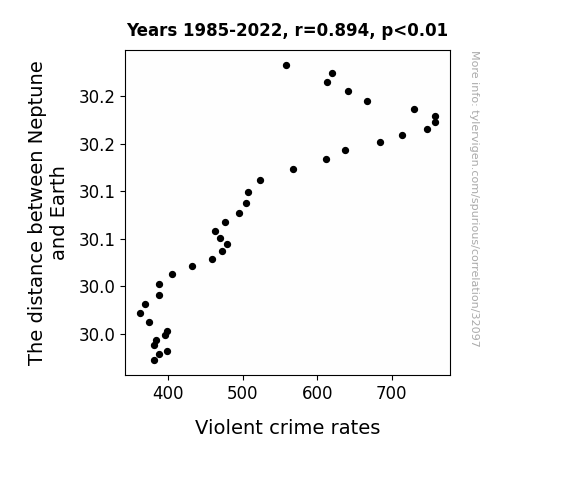 This means 79.9% of the change in the one variable (i.e., Violent crime rates) is predictable based on the change in the other (i.e., The distance between Neptune and Earth) over the 38 years from 1985 through 2022.