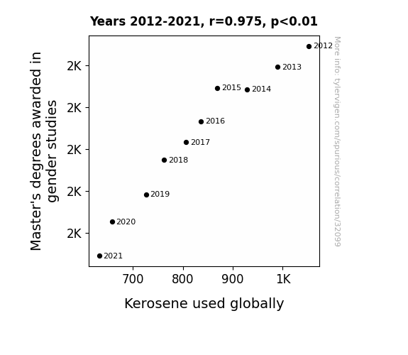 This means 95.1% of the change in the one variable (i.e., Kerosene used globally) is predictable based on the change in the other (i.e., Master's degrees awarded in gender studies) over the 10 years from 2012 through 2021.