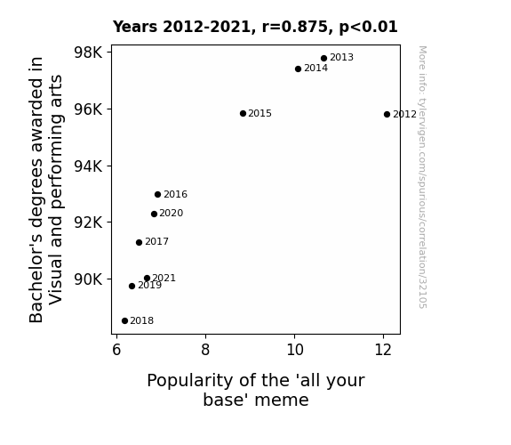 This means 76.6% of the change in the one variable (i.e., Popularity of the 'all your base' meme) is predictable based on the change in the other (i.e., Bachelor's degrees awarded in Visual and performing arts) over the 10 years from 2012 through 2021.