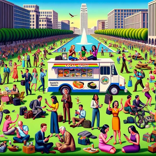 ChatGPT: In a bustling city, a group of individuals with freshly awarded Master's degrees in Parks & Recreation gather together in a park. They engage in various outdoor activities and discussion, while in the background, a colorful food truck serving sushi attracts their attention. Nearby, onlookers can be seen pulling out their phones and enthusiastically searching for "sushi near me" on Google, inspired by the graduates' interest in cultural experiences.