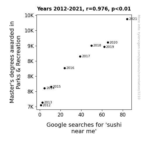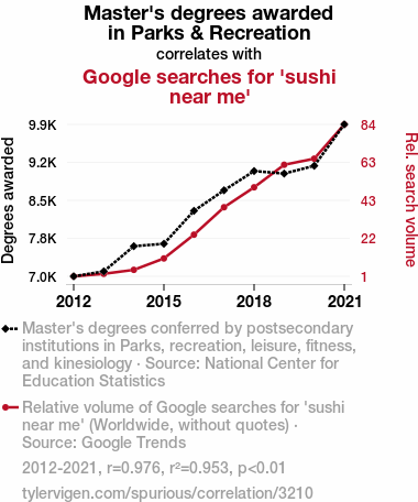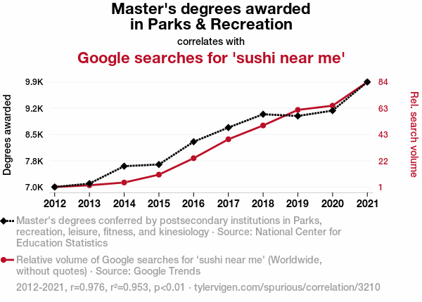 Parks & Recreation, Master's degrees, National Center for Education Statistics, Google Trends, sushi craving, 'sushi near me' searches, correlation coefficient, statistically significant, 2012-2021, academic pursuits, culinary cravings