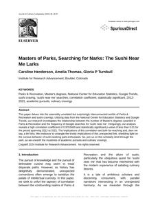 User prompt: Please provide potential search keywords for a paper titled Masters of Parks, Searching for Narks: The Sushi Near Me Larks with an abstract of This paper delves into the ostensibly unrelated but surprisingly interconnected worlds of Parks & Recreation and sushi cravings. Utilizing data from the National Center for Education Statistics and Google Trends, our research investigates the relationship between the number of Master's degrees awarded in Parks & Recreation and the frequency of Google searches for 'sushi near me'. Intriguingly, our analysis reveals a high correlation coefficient of 0.9763469 and statistically significant p-value of less than 0.01 for the period spanning 2012 to 2021. The implications of this correlation are both far-reaching and, dare we say, a bit fishy. We endeavor to untangle the knotty implications of this unexpected link, shedding light on the curious behavior of sushi-seeking park enthusiasts. So, join us on this scholarly stroll through the park, as we unearth the mysteries of academic pursuits and culinary cravings.