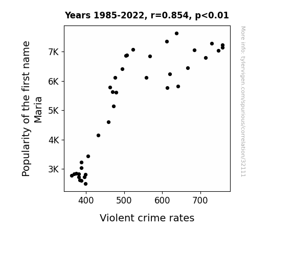 This means 72.9% of the change in the one variable (i.e., Violent crime rates) is predictable based on the change in the other (i.e., Popularity of the first name Maria) over the 38 years from 1985 through 2022.