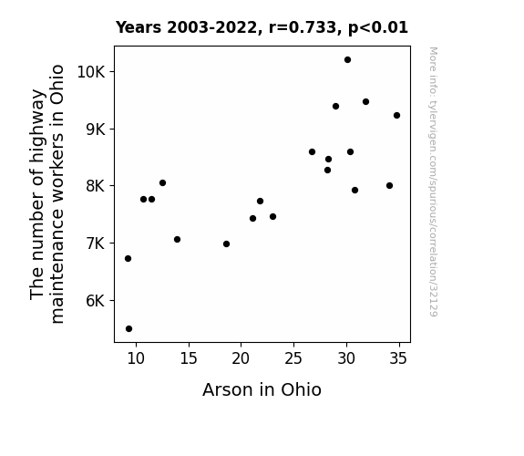 This means 53.8% of the change in the one variable (i.e., Arson in Ohio) is predictable based on the change in the other (i.e., The number of highway maintenance workers in Ohio) over the 20 years from 2003 through 2022.