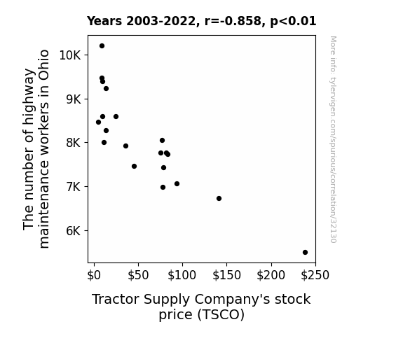 This means 73.6% of the change in the one variable (i.e., Tractor Supply Company's stock price (TSCO)) is predictable based on the change in the other (i.e., The number of highway maintenance workers in Ohio) over the 20 years from 2003 through 2022.