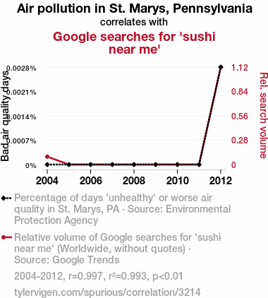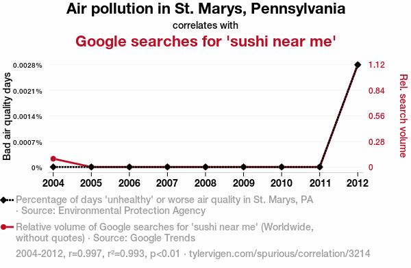 sushi cravings, air pollution, St. Marys Pennsylvania, environmental factors, human behavior, air quality, sushi near me searches, EPA data, Google Trends, correlation coefficient, p-value, 2004-2012, impact of air quality, causation vs correlation