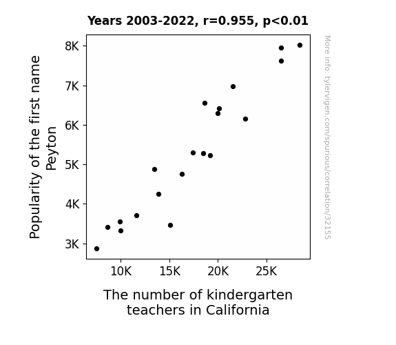 This means 91.3% of the change in the one variable (i.e., The number of kindergarten teachers in California) is predictable based on the change in the other (i.e., Popularity of the first name Peyton) over the 20 years from 2003 through 2022.