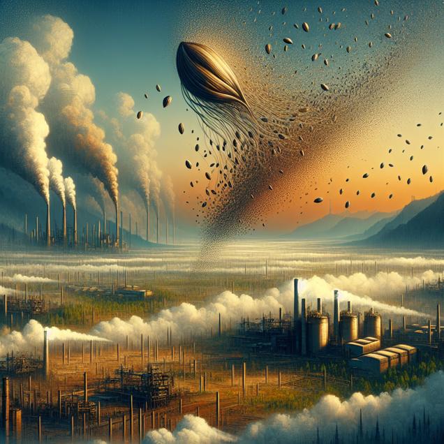 ChatGPT: In Muskegon, Michigan, an industrial area releases thick smoke and pollutants into the air. The hazy sky is filled with smog. Against this backdrop, airborne seeds from the remaining forest cover in the Brazilian Amazon ride on pollution particles, creating a mystical scene as they travel across the globe and begin to sprout new trees in South America.