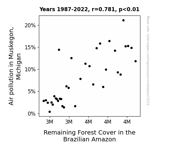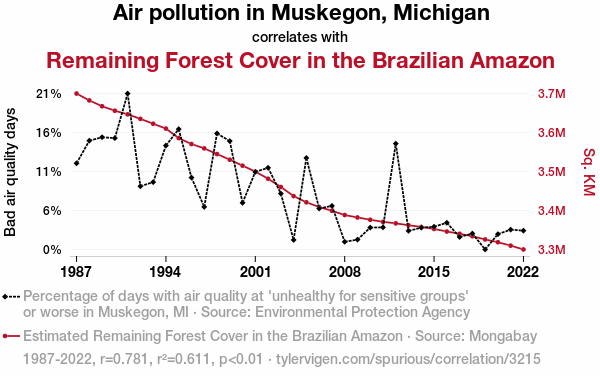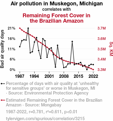 This means 61.1% of the change in the one variable (i.e., Remaining Forest Cover in the Brazilian Amazon) is predictable based on the change in the other (i.e., Air pollution in Muskegon, Michigan) over the 36 years from 1987 through 2022.