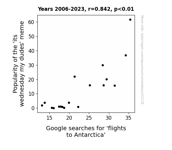 This means 70.9% of the change in the one variable (i.e., Google searches for 'flights to Antarctica') is predictable based on the change in the other (i.e., Popularity of the 'its wednesday my dudes' meme) over the 18 years from 2006 through 2023.