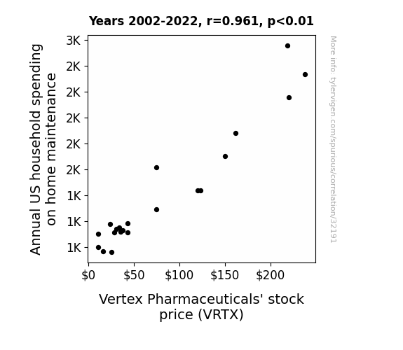 This means 92.3% of the change in the one variable (i.e., Vertex Pharmaceuticals' stock price (VRTX)) is predictable based on the change in the other (i.e., Annual US household spending on home maintenance) over the 21 years from 2002 through 2022.