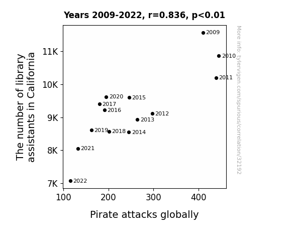 This means 69.9% of the change in the one variable (i.e., Pirate attacks globally) is predictable based on the change in the other (i.e., The number of library assistants in California) over the 14 years from 2009 through 2022.