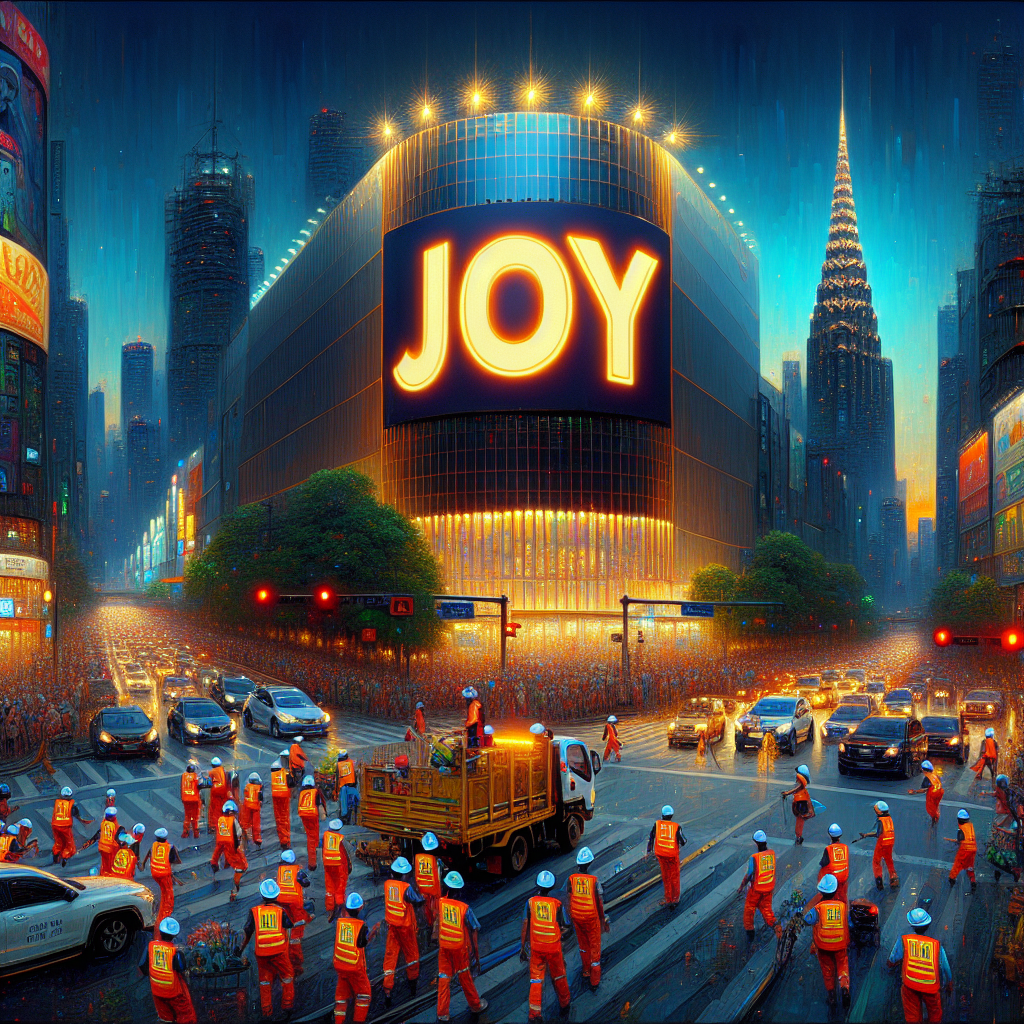 Prompt: Style: TIME magazine cover image Scene Description: In a bustling Massachusetts city, the name "Joy" is prominently displayed on a brightly lit billboard, symbolizing its growing popularity. Alongside, a team of traffic technicians in bright orange vests work diligently at a busy intersection, responding to and documenting the increasing number of traffic accidents caused by the parental joy of the named Joy. Image Generation Prompt: Generate an image that features a vibrant cityscape at dusk, with a towering billboard prominently displaying the name "Joy" in glowing lights. Show a group of traffic technicians clad in bright orange vests working amidst the bustling intersection, capturing the chaos and activity as a result of the growing popularity of the name "Joy." Capture the energy and contrast between the bustling city and the focused efforts of the traffic technicians. The depiction should include only scenes, people, and objects, it should not include text or speech bubbles.