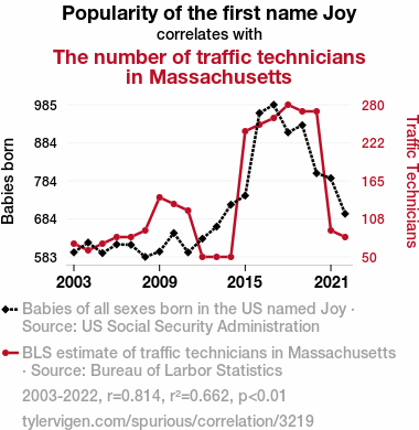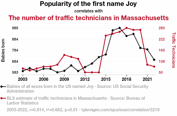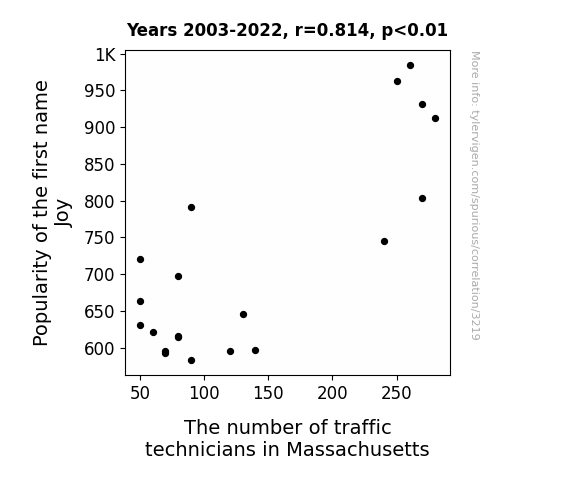 User prompt: Please provide potential search keywords for a paper titled Joys and Traffic Cohorts: Exploring the Jolly Connection with an abstract of The present study delves into the curious correlation between the popularity of the first name "Joy" and the number of traffic technicians in the state of Massachusetts. While the pair seems unrelated at first glance, our research aimed to shed light on any potential connection. By utilizing data from the US Social Security Administration and the Bureau of Labor Statistics, we uncovered a surprising correlation coefficient of 0.8135961 and p < 0.01 for the years 2003 to 2022.