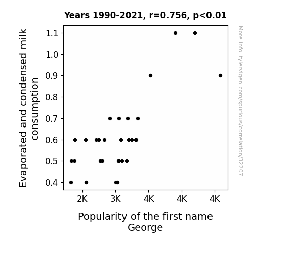 This means 57.2% of the change in the one variable (i.e., Popularity of the first name George) is predictable based on the change in the other (i.e., Evaporated and condensed milk consumption) over the 32 years from 1990 through 2021.