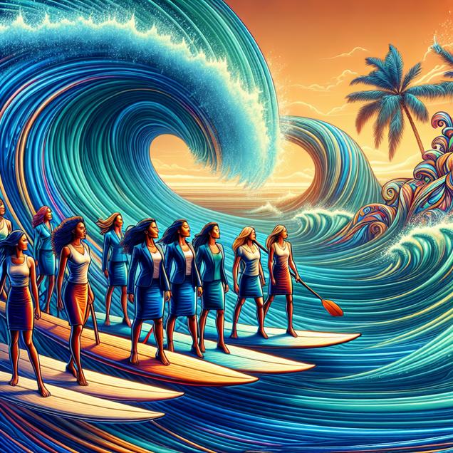 Prompt: [ Symbolism ] Generate an image of a vibrant Hawaiian landscape with a prominent wave-like formation emerging from the sea. Amidst the waves, a group of professional-looking women, all named Marilyn, stand on surfboards with determination and focus. The wave and the women symbolize the rising popularity of the name "Marilyn" that has brought a surge of aspiring economists to the Hawaiian island. In the background, a swaying palm tree stands tall, with a subtle glimmer reflecting the economic theories and statistical analyses that these Marilyns embody. The depiction should include only scenes, people, and objects, it should not include text or speech bubbles.