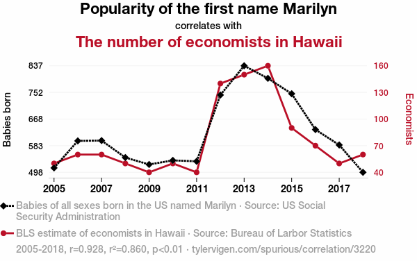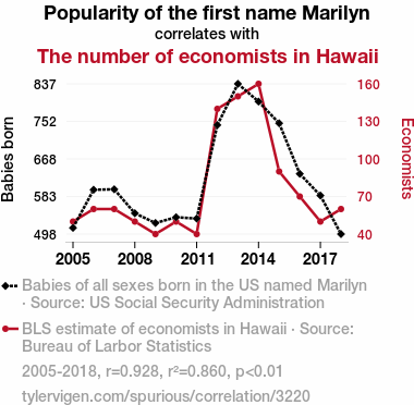 - The spurious research paper: The Marilyn Effect: A 'Name-worthy' Correlation Between Popularity of the First Name Marilyn and the Number of Economists in Hawaii