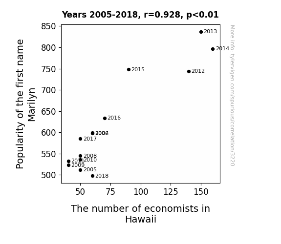 The results of our investigation revealed a remarkably strong correlation between the frequency of the first name Marilyn and the number of economists in Hawaii for the period 2005 to 2018. The correlation coefficient clocked in at an impressive 0.9275355, with an r-squared value of 0.8603221, and a p-value of less than 0.01. If this correlation were a superhero, it would definitely be "Marv-elous Marilyn" swooping in to save the day!