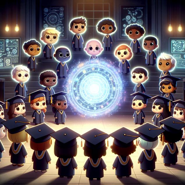 Prompt:  Description: In the dimly lit laboratory, a group of adorable 2D animated physical science graduates are wearing graduation gowns and holding their newly awarded Associate's degrees. They stand in a circle, their cute, determined expressions radiating determination as they concentrate. Their combined energy creates a shimmering, glowing portal. Through it, adorable statisticians from all over Michigan start appearing, drawn by the mysterious call of the League of Statisticians. The room fills with the sound of excited chatter as the newly arrived statisticians are welcomed into the secret society. The scene is heartwarming and filled with a sense of wonder and inclusion. The depiction should include only scenes, people, and objects, it should not include text or speech bubbles.